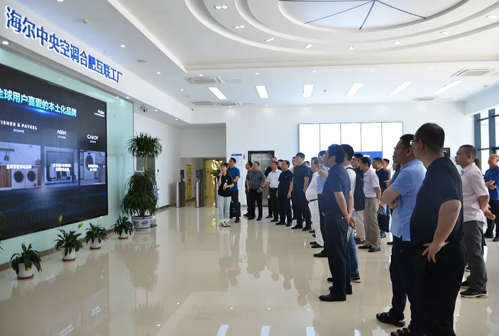 結束了合鍛智能的考察交流后,考察團一行來到了海爾中央空調合肥互聯工廠。2023年底,世界經濟論壇發布第11批全球“燈塔工廠”名單中,海爾中央空調合肥互聯工廠成功入選。“燈塔工廠”被譽為“世界上最先進的工廠”,代表當今全球制造業領域智能制造和數字化最高水平。在工廠展廳里,講解員向大家播放了合肥海爾工廠的宣傳片,簡要介紹了中央空調工廠布局、產線設計、產品特點等。參觀完展廳后,在工廠負責人的帶領下,考察團有序走進生產廠區,整潔的廠區環境、錯落有致的綠地景觀、別出心裁的休息園地都再向大家展示著一座世界五百強工廠的規范管理。走進車間,工廠負責人向考察團細致的講解生產線的工藝布局與技術特點。在參觀通道兩側懸掛著各類展板,上面是海爾集團生產經營的創新理念、是海爾集團“人單合一”模式的各種詮釋、是海爾人持續探索生態品牌戰略建設的點滴努力。